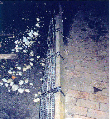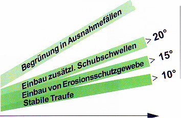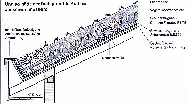 Experten analysieren die Gründe Der Begrünungsaufbau stellte sich wie folgt dar: Auf einer wurzelfesten Dachabdichtung wurden Noppenbahnen eines norwegischen Herstellers aufgebracht, die knapp 10 mm hohe Noppen aufweisen und nicht rutschhemmend sind. Die Fixierung dieser Dränageschicht wurde mit Nägeln vorgenommen. Die zum Sortiment des Herstellers gehörenden Nägel wurden durch die Noppenbahn und Abdichtung in die Unterkonstruktion geschlagen. Eine ca. 15 cm starke Mutterbodenschicht sowie eine Raseneinsaat rundeten den Begrünungsaufbau ab. Die Traufe erhielt einen Holzbalken, der mit Stahlwinkeln an der Dachkonstruktion befestigt wurde. Diese Befestigung hielt letztendlich nicht stand. |