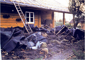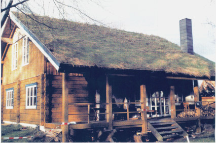![]() Von 1995 bis 1999 schmückte ein Grasdach dieses Blockhaus in der Nähe von Bremen. Das