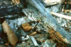 Hier ein partiell verkohlter Dachstuhl (vermutlich nach