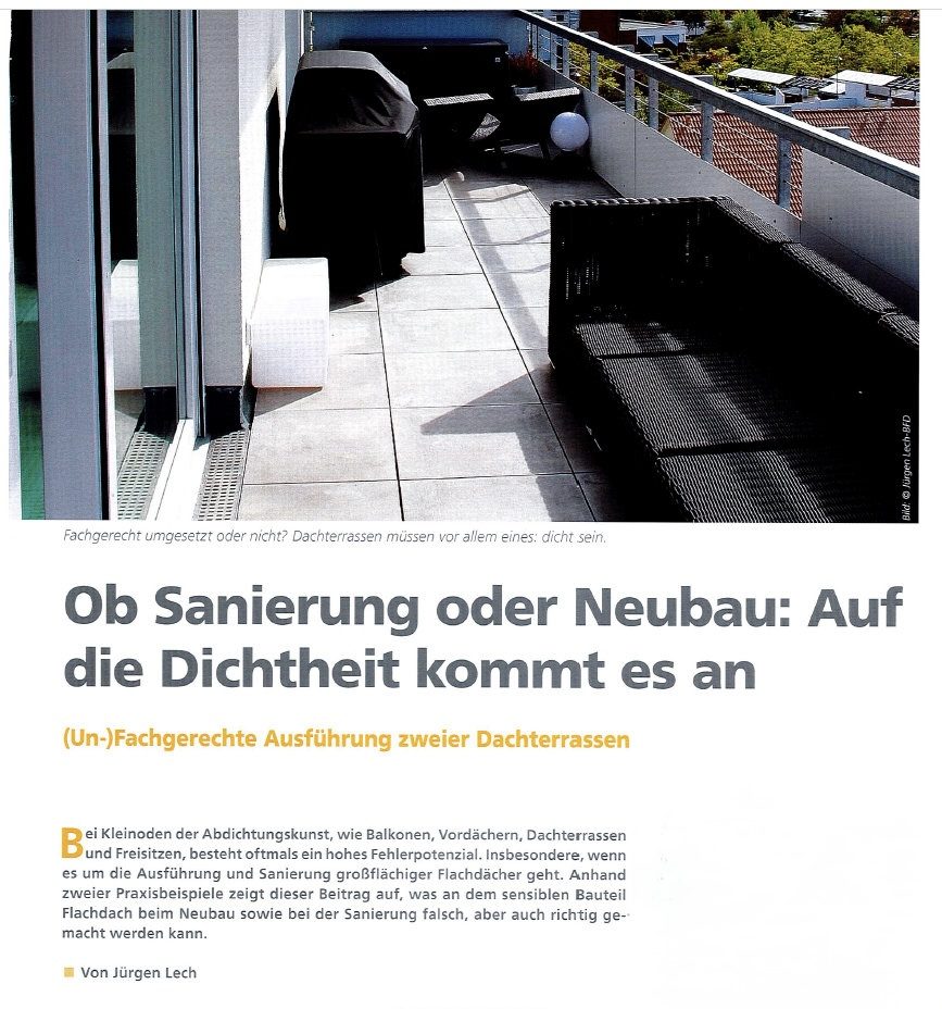 Für diesen "begrenzten" Fachbereich, der im wesentlichen die Dacheindeckung, die Dachabdichtung, die Terrassen-, Balkone-, Tiefgaragen-, Kellerwand-, Bodenabdichtung und die Dachbegrünung umfasst, für die Bereiche die sehr stark feuchtigkeitsbelastet sind, die Temperaturschwankungen unterliegen, die begangen, befahren, begrünt, belüftet oder unbelüftet sind oder werden.....